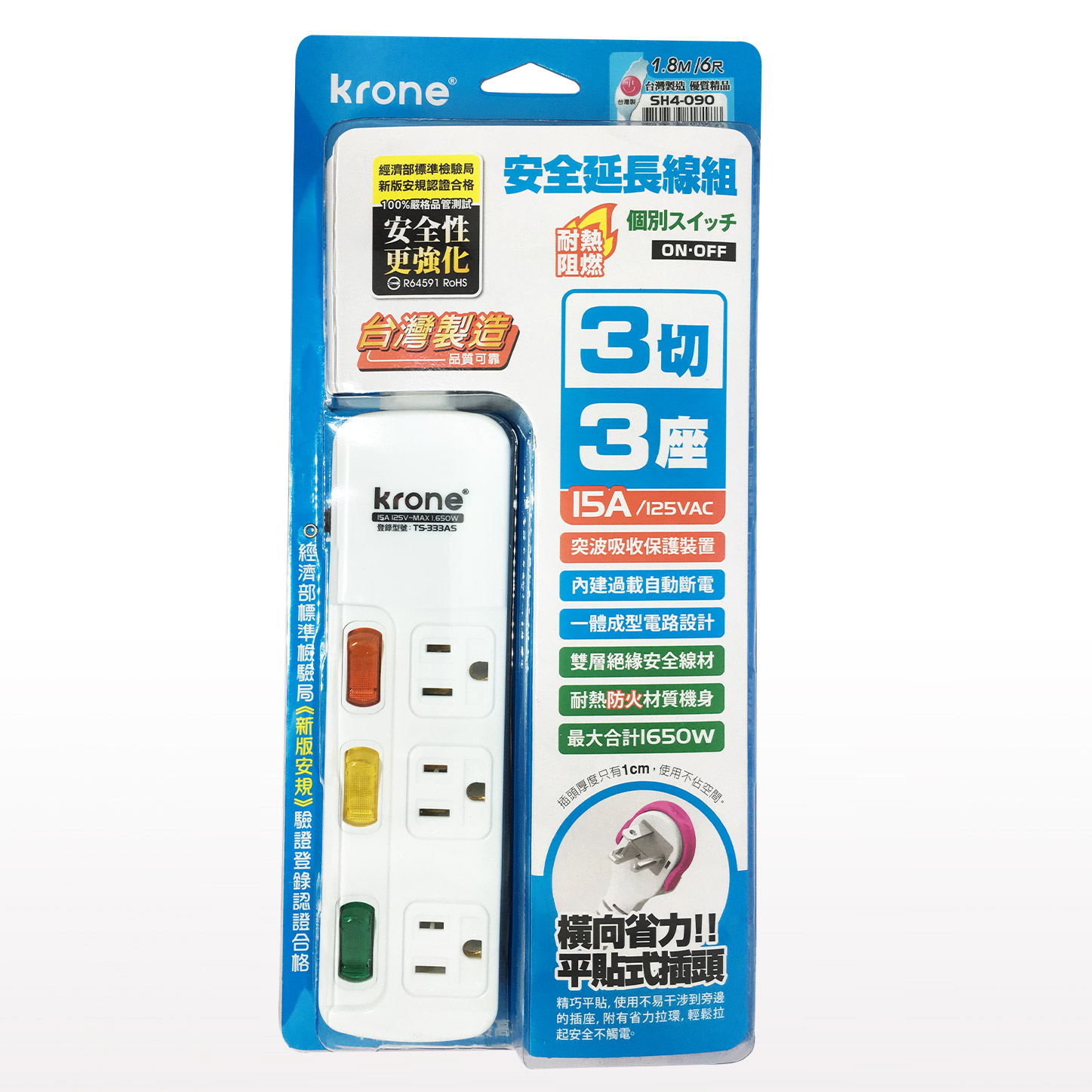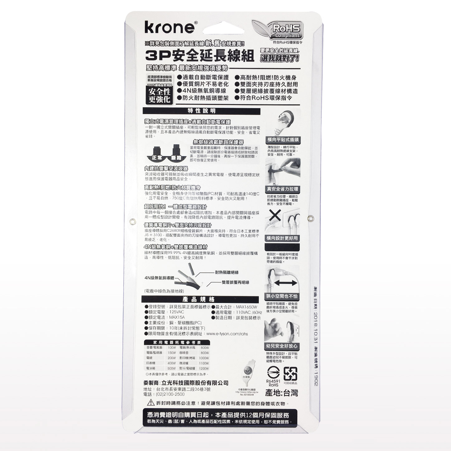 單位:組 1.8米 新版安規驗證登錄認證合格 內建抗雷擊突波吸器 過載自動斷電系統保護裝置 高耐熱阻燃材質插座 4N級無氧銅+雙披覆構造線材 專利扁頭設計 台灣製造 額定電壓:125VAC 額定電流:MAX15A 最大合計:1650W 適用電壓:110VAC / 60Hz