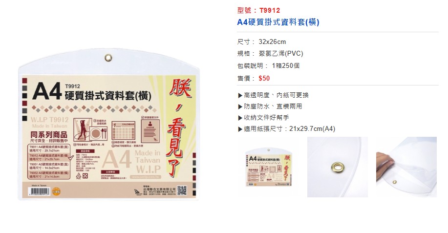 A4硬質掛式資料套-橫 T9912 (尺寸: 32x26cm)