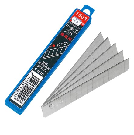 單位:盒 │1503│高硬度美工刀片_9mm 產品特色 : • 進口合金SK2+鉻 包裝方式 10片/盒,10盒/中盒,20中盒/箱 建議售價 50元/盒 規格尺寸 9mm x 80mm 產品條碼 4711734150317